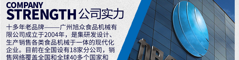 廣州旭眾食品機械有限公司是一家集科研開發(fā),生產(chǎn)設計,營銷服務為一體的現(xiàn)代化生產(chǎn)企業(yè)。現(xiàn)代化生產(chǎn)車間,精湛制造技術,所產(chǎn)機械歷經(jīng)市場重重考驗,不斷贏得海內(nèi)外客戶的贊譽。