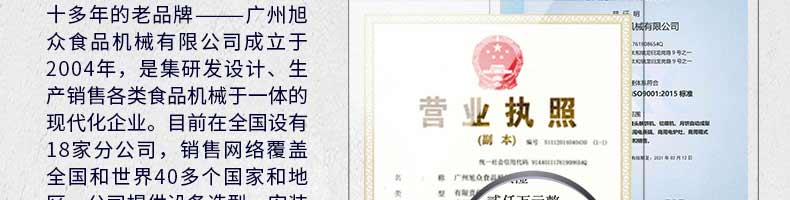 廣州旭眾食品機械有限公司是一家集科研開發(fā),生產(chǎn)設(shè)計,營銷服務(wù)為一體的現(xiàn)代化生產(chǎn)企業(yè)?,F(xiàn)代化生產(chǎn)車間,精湛制造技術(shù),所產(chǎn)機械歷經(jīng)市場重重考驗,不斷贏得海內(nèi)外客戶的贊譽。
