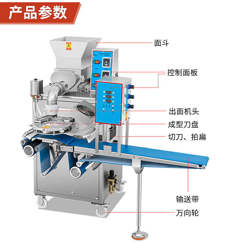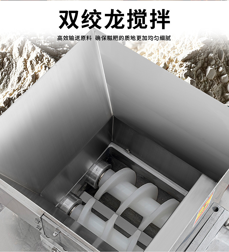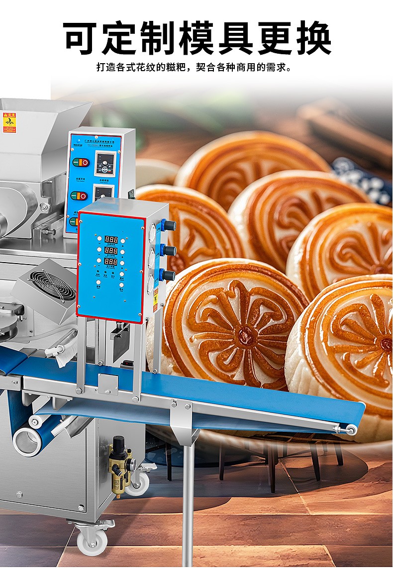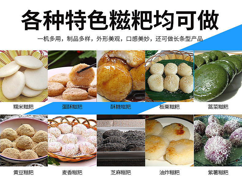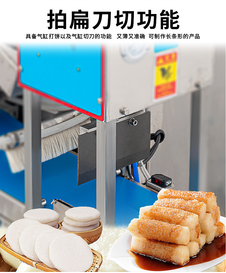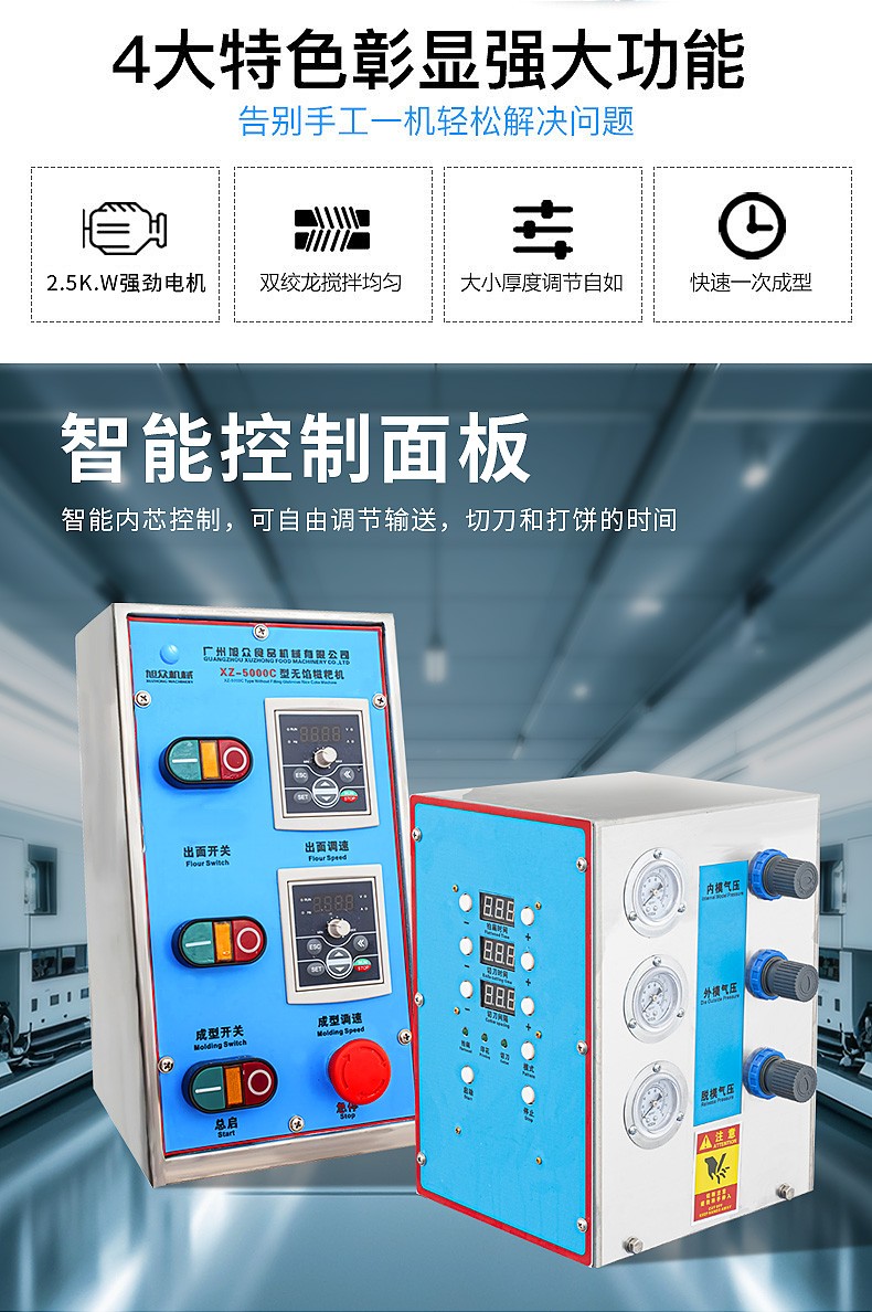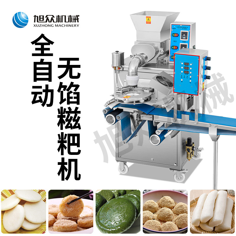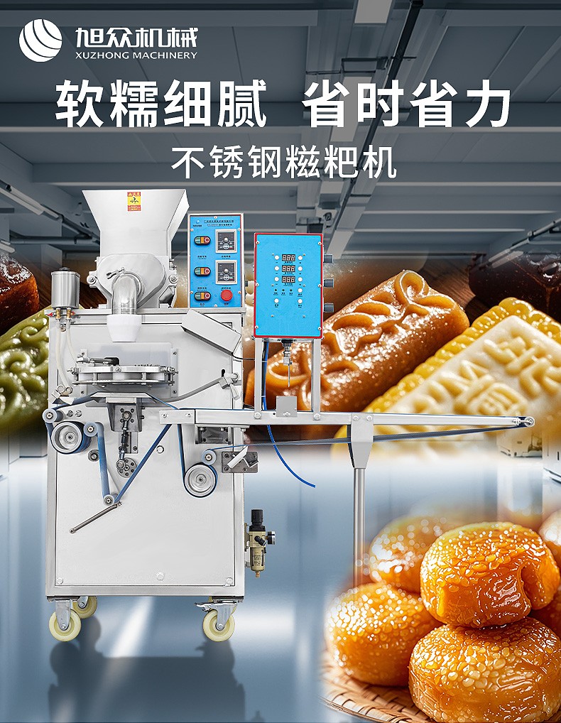 XZ-5000C糍粑機,軟糯細膩、省時省力,不銹鋼糍粑機。智能控制面板,智能內芯控制,可自由調節輸送,切刀和打餅的時間。拍扁刀切功能,具備氣缸打餅以及氣缸切刀的功能、又薄又準確、可制作長條形的產品。