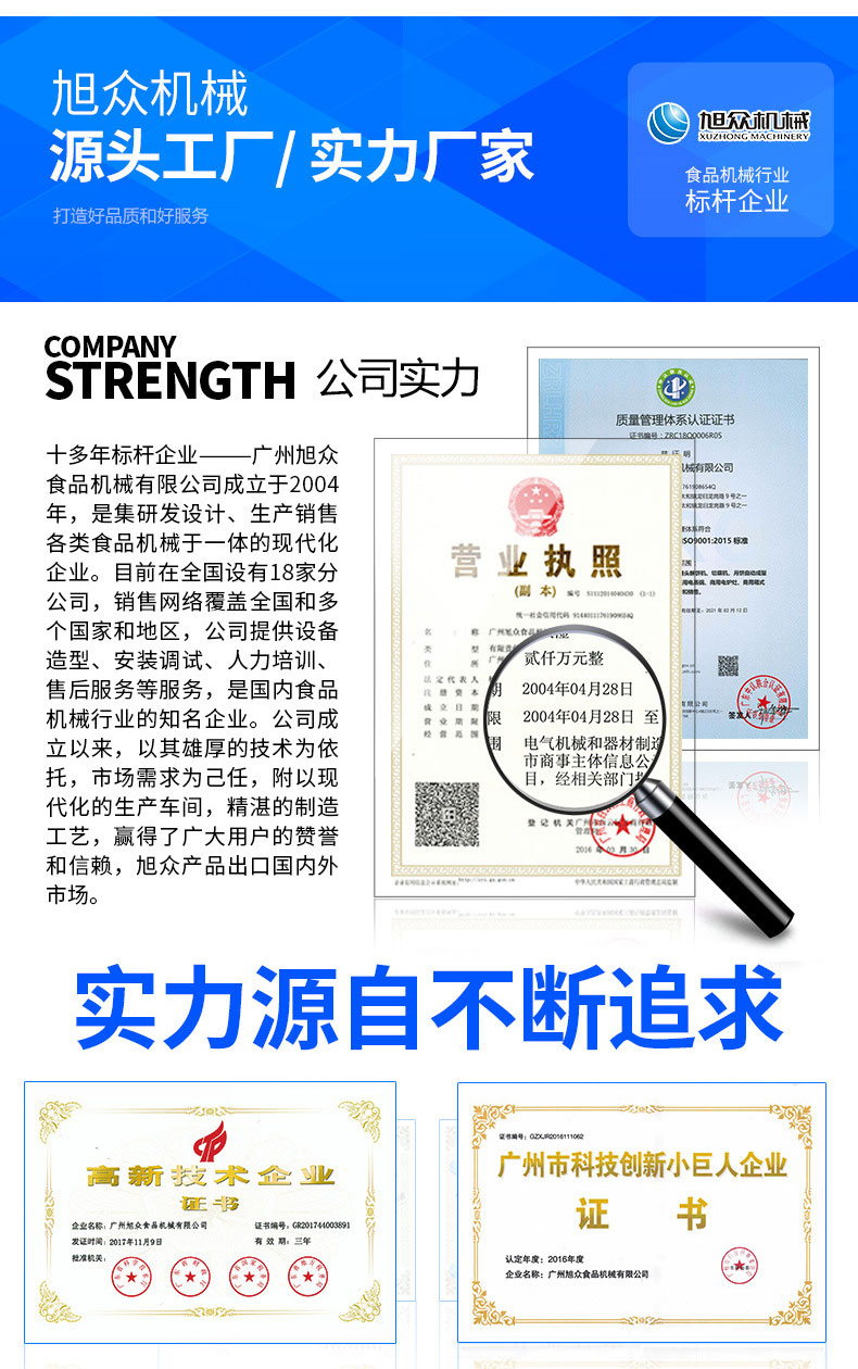 廣州旭眾食品機械有限公司是一家集科研開發,生產設計,營銷服務為一體的現代化生產企業?,F代化生產車間,精湛制造技術,所產機械歷經市場重重考驗,不斷贏得海內外客戶的贊譽。