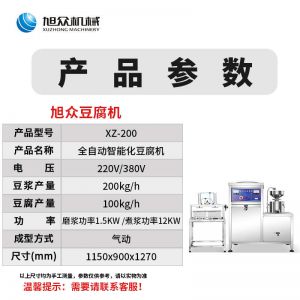 XZ-300型氣動壓榨豆腐機,智能豆腐豆?jié){機,雙桶煮漿高效生產(chǎn)現(xiàn)磨現(xiàn)煮,漿渣分離快速出漿。機器運行穩(wěn)定不銹鋼材質(zhì)打造,堅固耐用,安全衛(wèi)生,時尚大方,易于清洗。