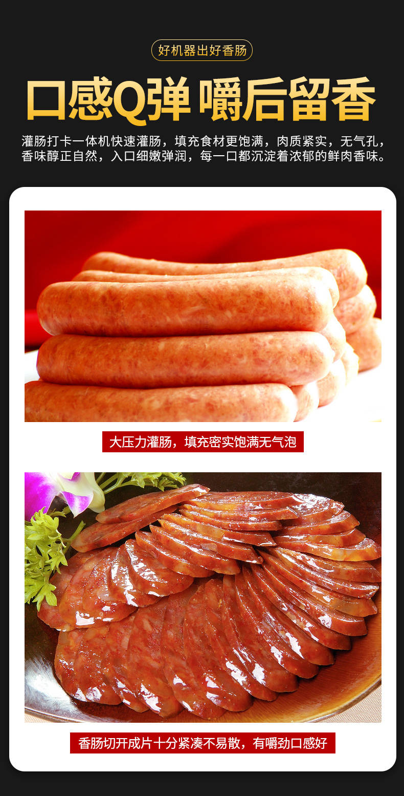 XZ-I型自動定量灌腸機,使用優質不銹鋼制造,符合食品機械的要求,只需1人操作,特別適合中小型肉食加工廠使用,以各種畜禽類肉糜為原料的香腸、火腿腸、熱狗等天然腸衣、蛋白腸衣、煙熏腸衣等制品,可以灌制定重量單腸,也可連續灌制長腸。