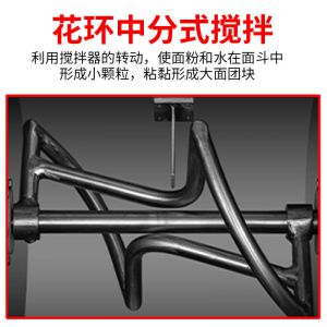 低噪音和面機,利用攪拌器的轉動,使面粉和水在面斗中形成小顆粒,粘黏形成大面團塊。大容量翻轉面斗,采用優質不銹鋼焊接制造,防腐蝕,食品接觸安全,符合食品生產安全標準。
