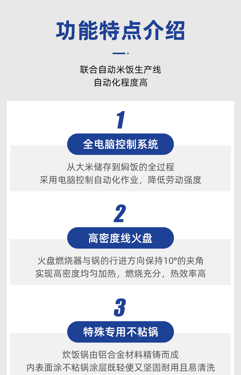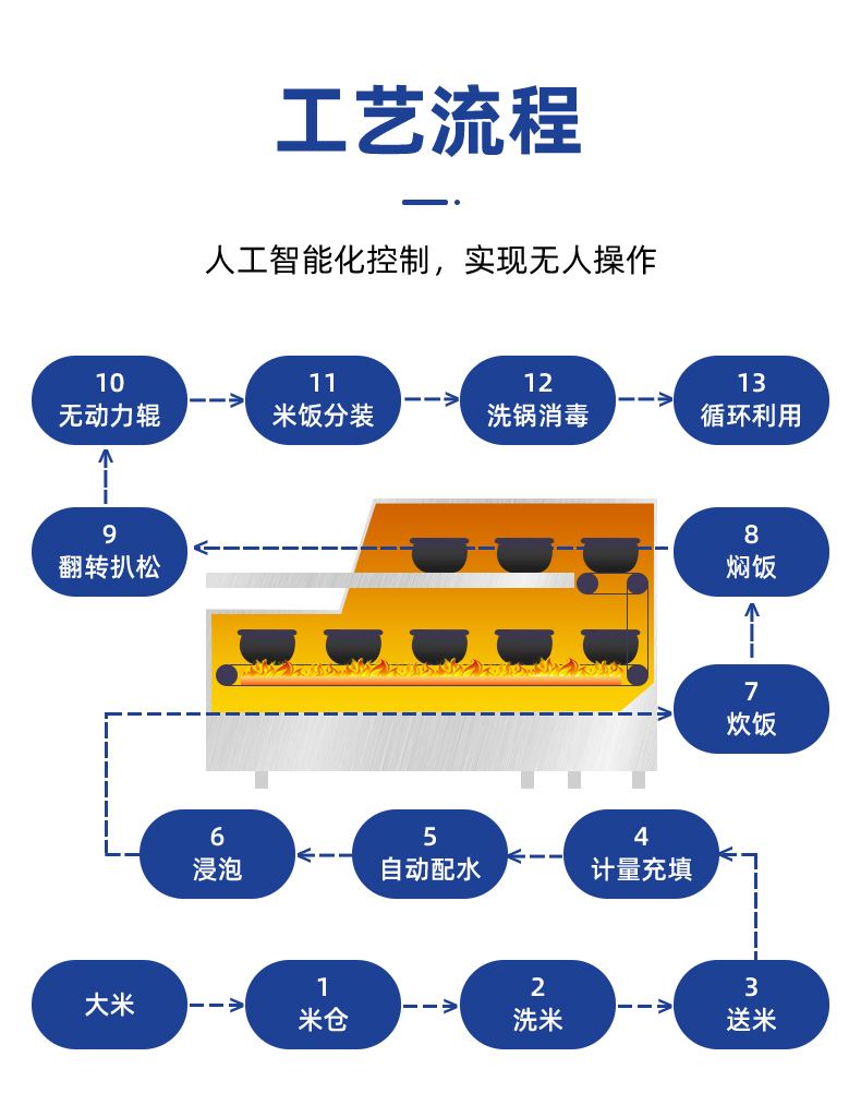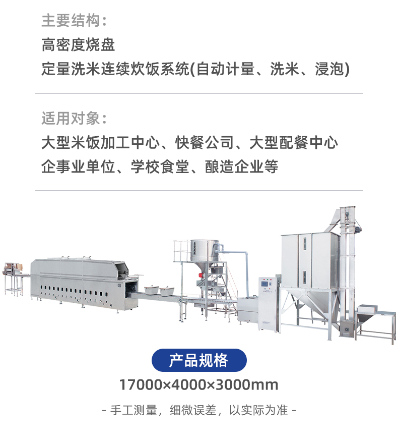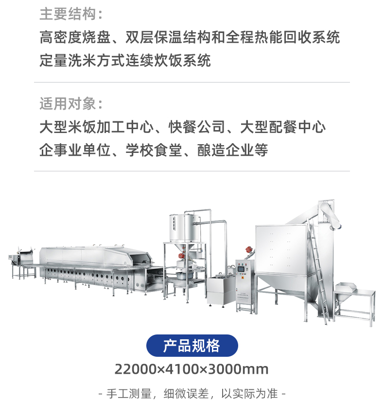 米飯生產(chǎn)線,主要結(jié)構(gòu):不銹鋼箱體,密閉不銹鋼飯盤,自動加熱循環(huán)系統(tǒng)。適用對象:大型米飯加工中心、快餐公司、大型配餐中心企事業(yè)單位、學(xué)校食堂、釀造企業(yè)等。實力大咖商用好幫手。提供培訓(xùn)、指導(dǎo)和工藝傳授,品牌服務(wù)有保障。