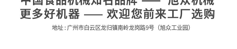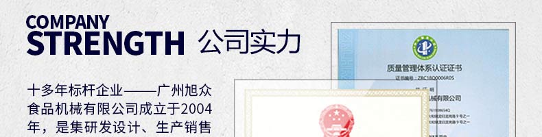 廣州旭眾食品機(jī)械有限公司是一家集科研開發(fā),生產(chǎn)設(shè)計(jì),營(yíng)銷服務(wù)為一體的現(xiàn)代化生產(chǎn)企業(yè)。現(xiàn)代化生產(chǎn)車間,精湛制造技術(shù),所產(chǎn)機(jī)械歷經(jīng)市場(chǎng)重重考驗(yàn),不斷贏得海內(nèi)外客戶的贊譽(yù)。
