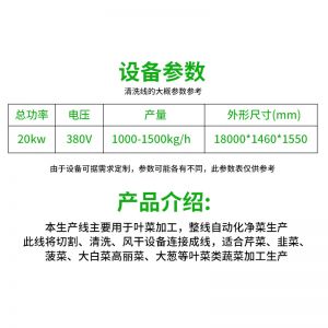 全自動大型葉菜清洗線,自動化程度高、整線設計合理、節約人工降低生產成本、外形美觀大方。主要用于葉菜加工,整線自動化凈菜生產此線將切割、清洗、風干設備連接成線,適合芹菜、韭菜菠菜、大白菜高麗菜、大蔥等葉菜類蔬菜加工生產