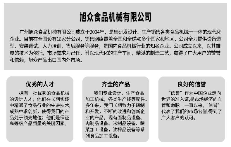廣州旭眾食品機械有限公司是一家集科研開發,生產設計,營銷服務為一體的現代化生產企業。現代化生產車間,精湛制造技術,所產機械歷經市場重重考驗,不斷贏得海內外客戶的贊譽。